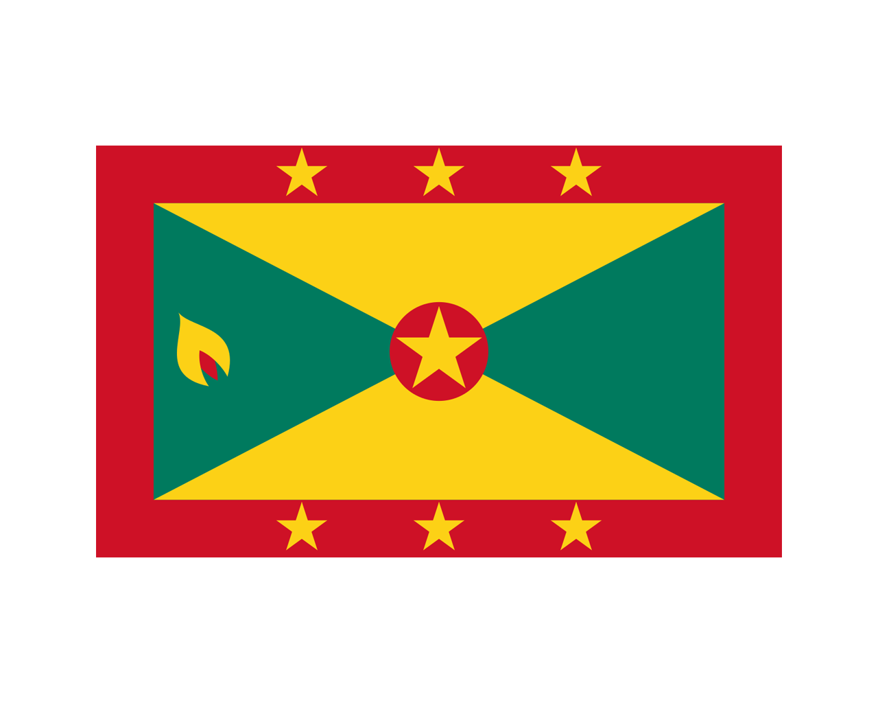格林納達(dá)(Grenada)位于東加勒比海向風(fēng)群島的最南端,屬于北美洲地區(qū)國家,首都圣喬治。格林納達(dá)國旗啟用于1974年2月7日。國旗呈長方形,長與寬之比為5:3,旗面四周為寬度相等的紅色寬邊,上下寬邊中各有三顆黃色五角星;中間由上下兩個(gè)黃色三角形,左右兩個(gè)綠色三角形組成一個(gè)長方形,中央為紅色小圓地,內(nèi)有一顆黃色五角星;左邊的綠色三角形中有一顆肉豆蔻圖案。紅色象征全國人民的友愛精神,綠色象征該島國的農(nóng)業(yè)和豐富的植物資源,黃色象征該國有充足的陽光。七顆五角星代表全國的七個(gè)教區(qū),該國居民大多數(shù)信奉天主教;肉豆蔻圖案表示該國的特產(chǎn)。