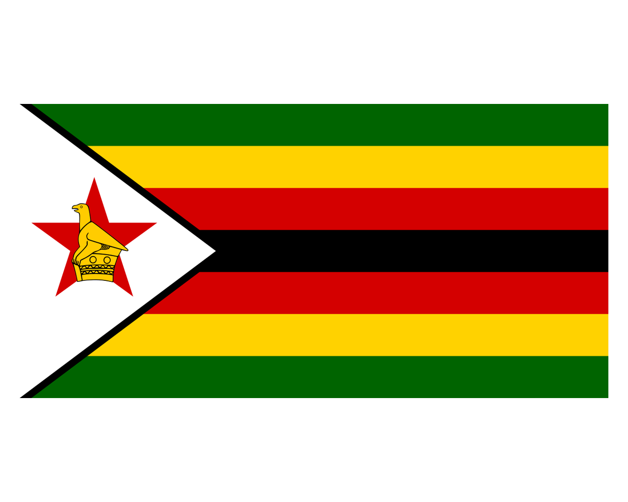 津巴布韋共和國(The Republic of Zimbabwe),簡稱津巴布韋,原稱羅得西亞(1980年前),是非洲東南部內(nèi)陸國,1980年4月18日獨立,首都哈拉雷。津巴布韋國旗啟用于1980年4月18日。呈橫長方形,長與寬之比為2∶1。靠旗桿一側為帶黑邊的白色等腰三角形,正中一顆紅色五角星,星內(nèi)有一只津巴布韋鳥,白色象征和平,五角星代表國家和民族的良好愿望,津巴布韋鳥是該國特有的標志,也是津巴布韋和非洲國家古老文明的象征;右側為七道平行橫條,黑色居中,向上下兩邊依次均為紅、黃、綠色。黑色代表占人口多數(shù)的黑人,紅色象征人民為爭取獨立而灑的鮮血,黃色象征礦產(chǎn)資源,綠色代表國家的農(nóng)業(yè)。
