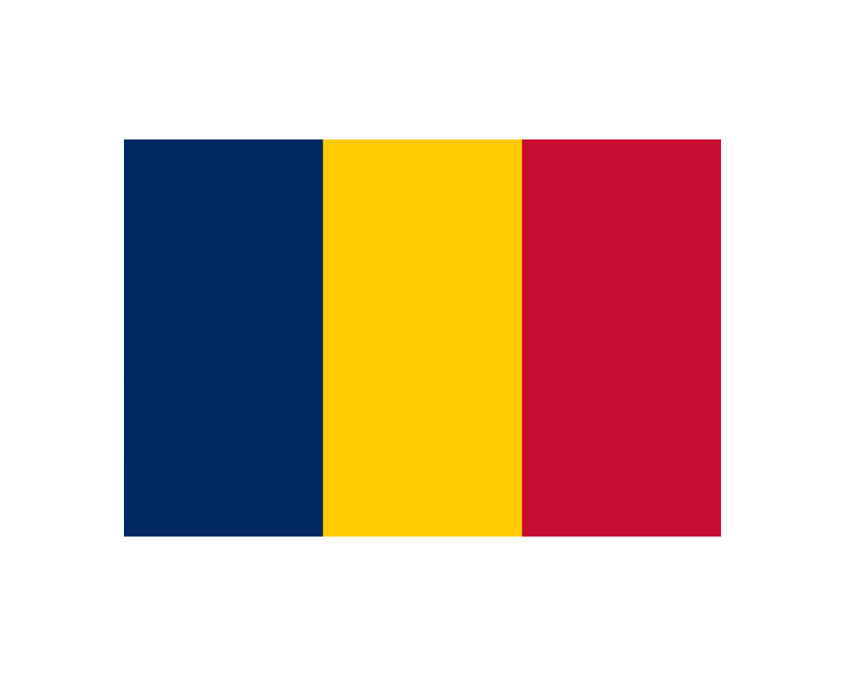 乍得共和國(Republic of Chad),簡稱“乍得”(或譯查德),是非洲中部的一個內陸國家,首都及最大城市為恩賈梅納。乍得國旗呈長方形,長與寬之比為3:2。旗面由三個平行相等的豎長方形構成。從左至右依次為藍、黃、紅三色。藍色象征藍天、希望和生活,還代表該國的南部;黃色象征陽光,以及該國的北部;紅色象征進步、團結和愿為祖國獻身的精神。乍得國旗與羅馬尼亞國旗幾乎相同。僅藍色部分略深。