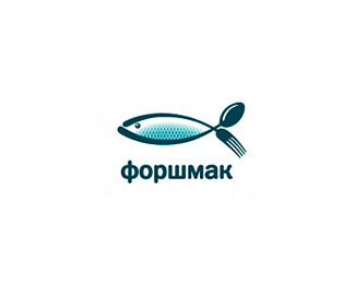 FORSHMAK餐廳標志設計欣賞,該標志的主識別圖形由彎曲的刀和叉組合成一條魚的形狀,整體的配色及創意都很棒。