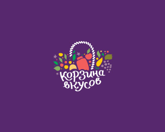 Корзинавкусов食品公司標(biāo)志設(shè)計,整體是一個籃子的造型,用各種水果、商品和品牌名稱構(gòu)成,顏色豐富、亮麗。