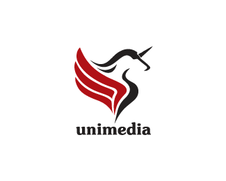 Unimedia廣告公司標志設計欣賞,使用天馬作為廣告公司標志的主創意圖形,整體以紅色和黑色的色彩組合。