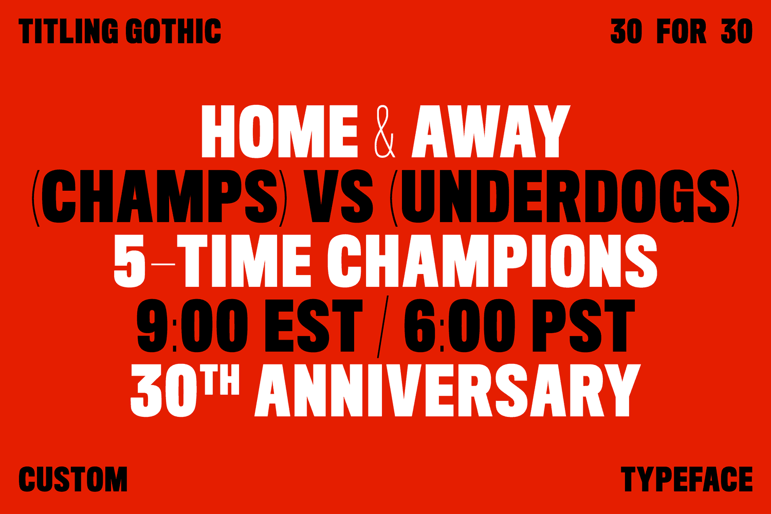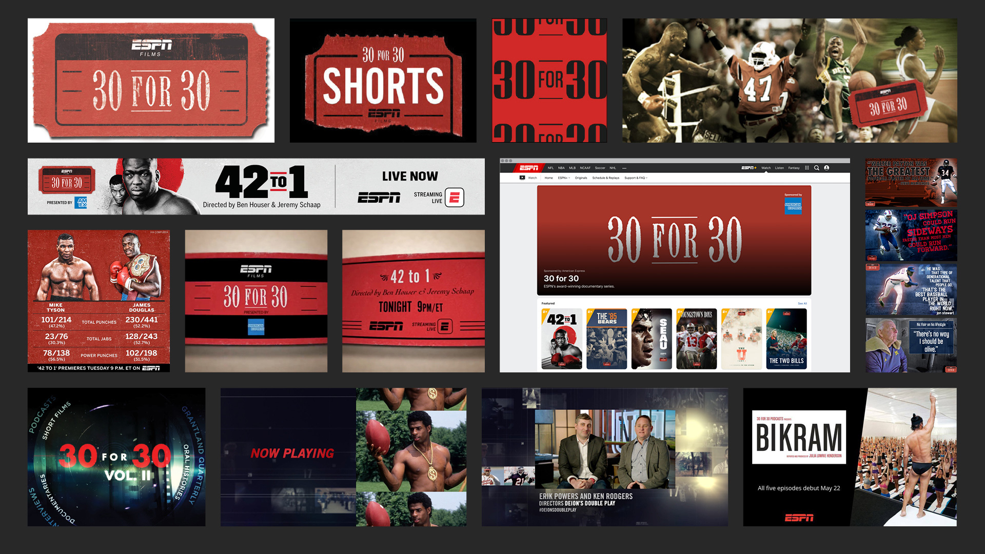 30 30的標題是一系列的紀錄片在espn播出,它的姐妹網絡和在線突出體育歷史上有趣的人物和事件。其中包括三集,每集30集,ESPN電影頻道2011-2012年的13集劇集,以及ESPN.com網站播放的30集30集短片。該系列還擴大到包括2014年世界杯之前播出的足球故事,以及音頻播客。